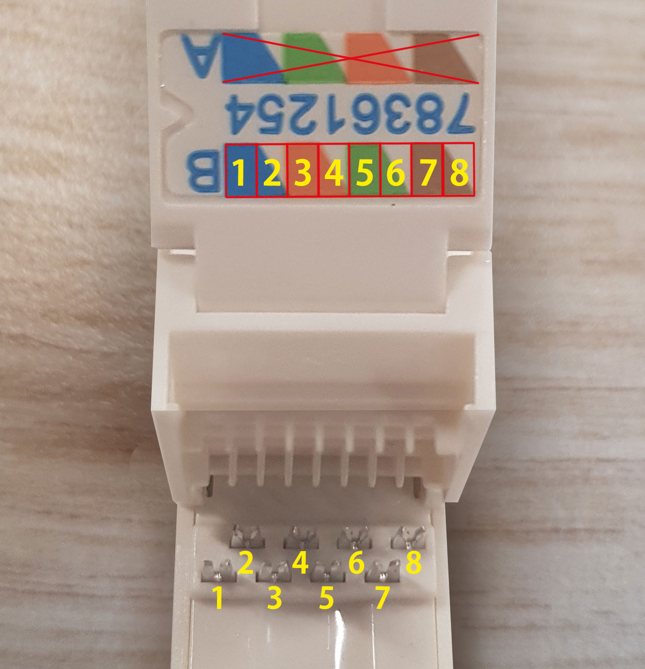 Wie gesagt, haben Keystones einen LSA-Streifen mit zwei Farbfolgen, die mit einem A und einem B gekennzeichnet sind. In Europa wird als Standard immer die B-Norm verwendet. Bei der Montage eines Starrleiter-Kabels auf einem Keystone muss die mit “B" gekennzeichnete Farbreihenfolge verwendet werden. Diese Farbreihenfolge kann jedoch pro Keystone anders sein. Wenn Sie Änderungen an einem bestehenden Netzwerk vornehmen, z. B. Kabel am Arbeitsplatz sauber verlegen, überprüfen Sie, welche Farbreihenfolge im Datenschrank verwendet wurde.